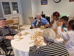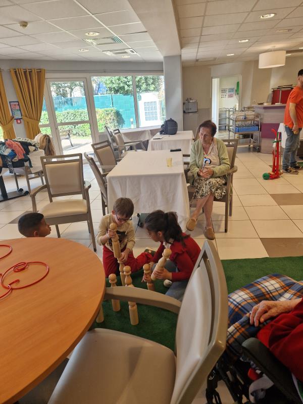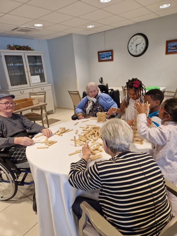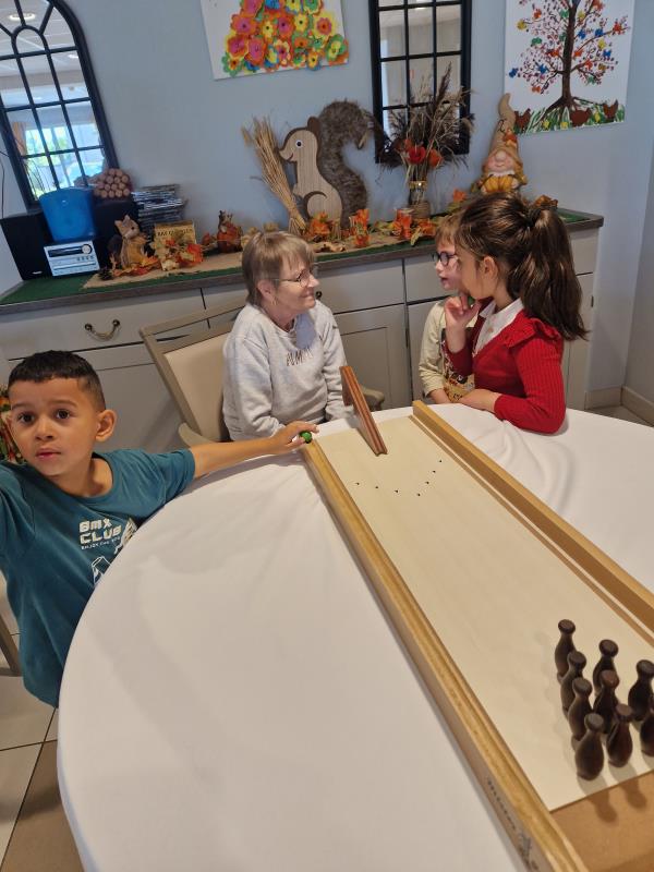 Dans le cadre de la semaine bleue nous avons organisé une rencontre intergénérationnelle avec les élèves de la classe de CP de L'école Pierre Mendès France. Plus jeunes et anciens ont joué avec différents jeux en bois (kappla,billard hollandais,criquet, bowling...) cette animation a été très appréciée de tous et la maitresse a même trouvé cela pédagogique car cela permettait aux enfants d'apprendre à calculer! une animation à refaire selon elle!