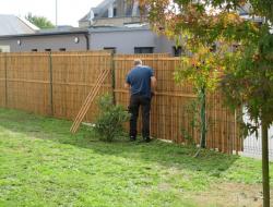 Nous posons un bardage au ton chaleureux pour habiller le grillage industriel qui clôture le jardin de la résidence.